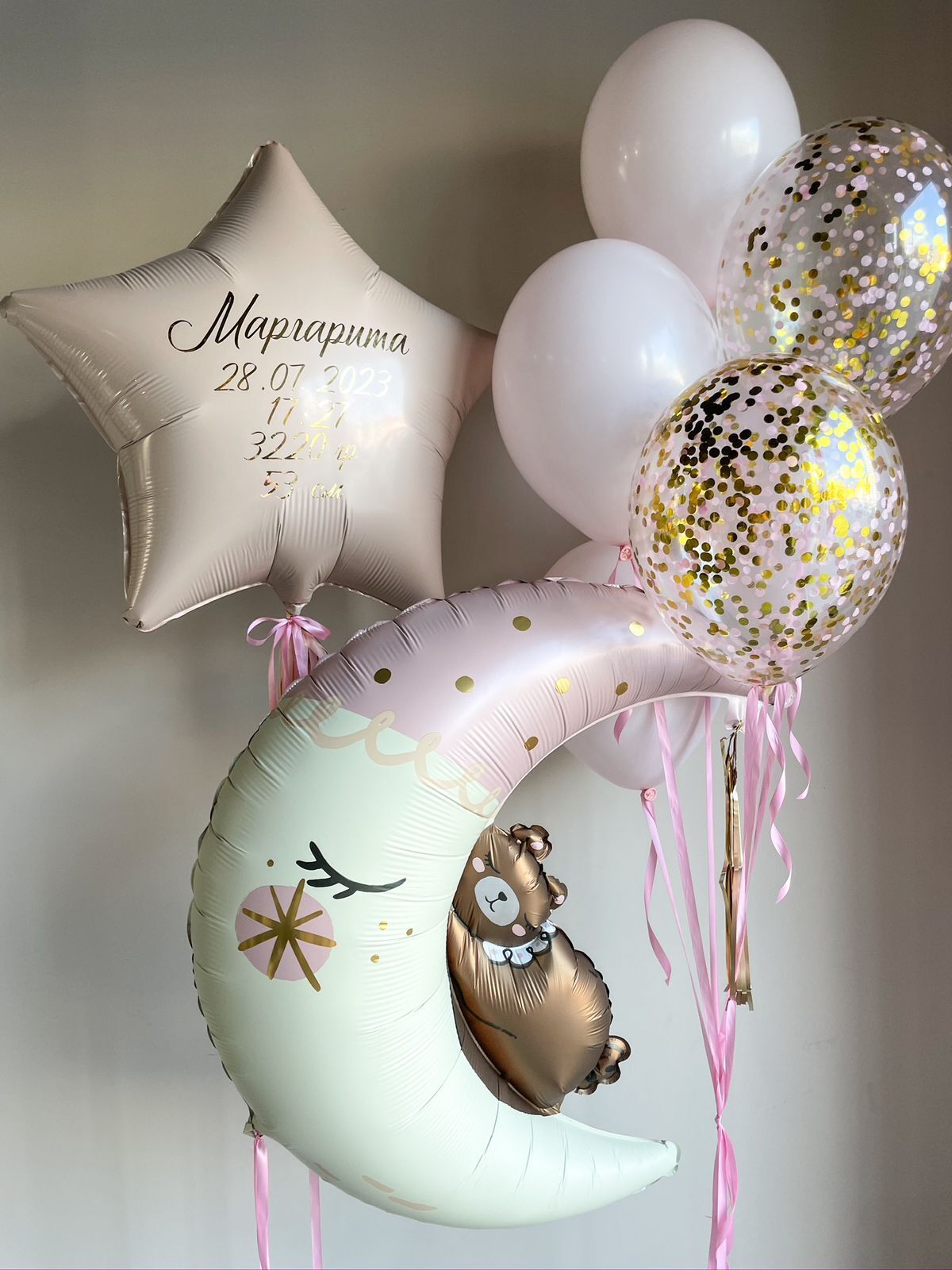 • Фонтан из 6 шаров (4 розовый макарунс, 2 прозрачных с конфетти)