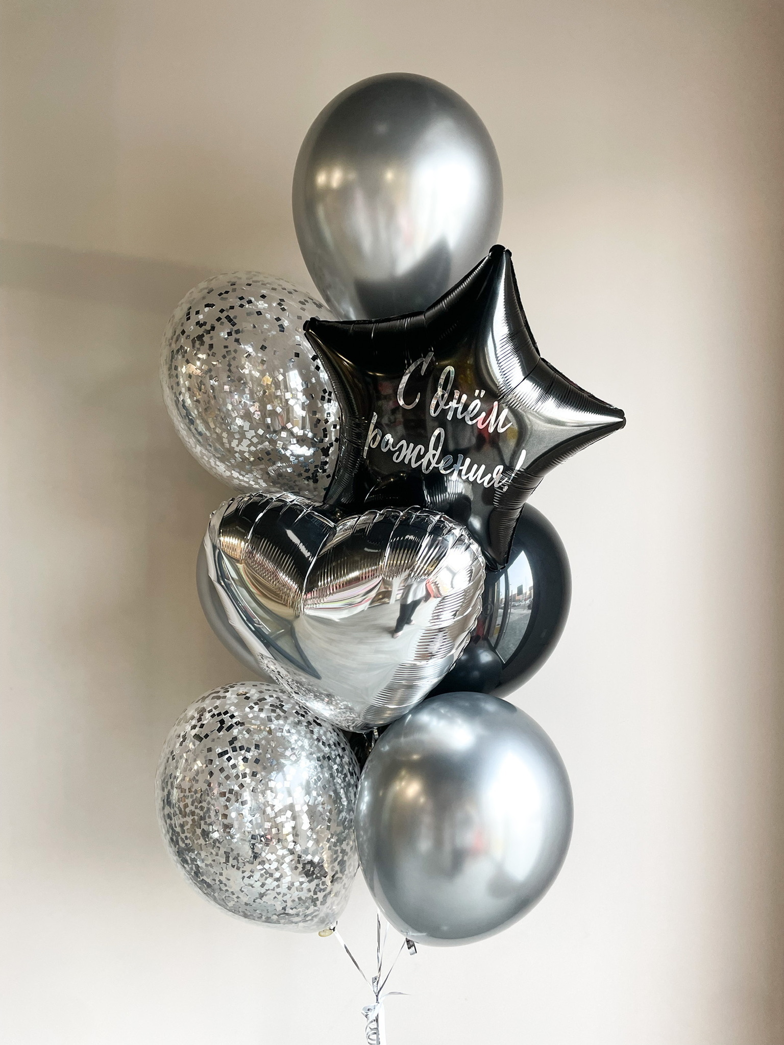 - Фонтан из 10 шаров: сердце, звезда с надписью, 3 хром, 2 с конфетти, 3 однотонных