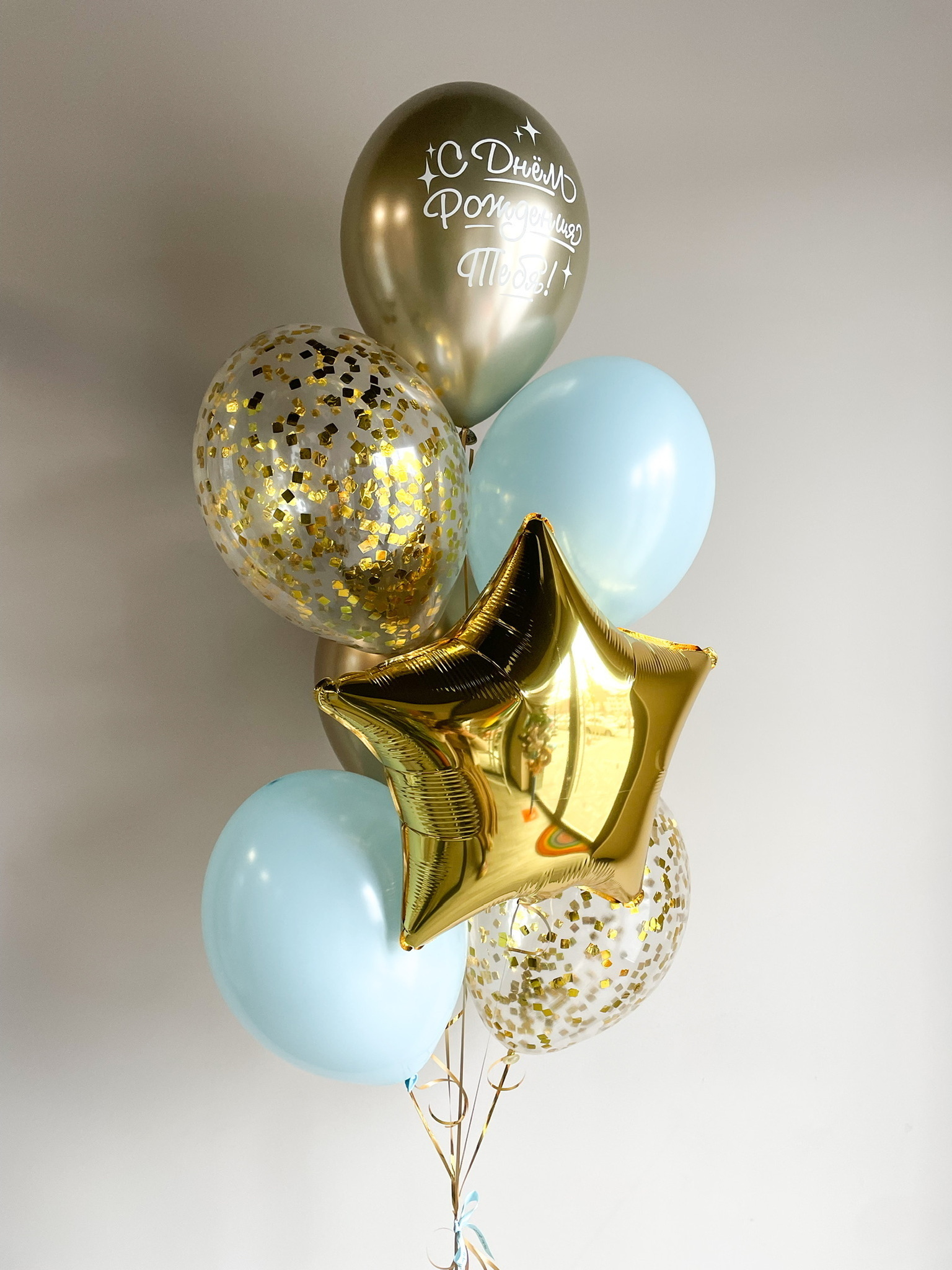 • Фонтан из 7 шаров (звезда 45 см золото, 2 хром золото, 2 голубой макарунс, 2 прозрачных с конфетти)