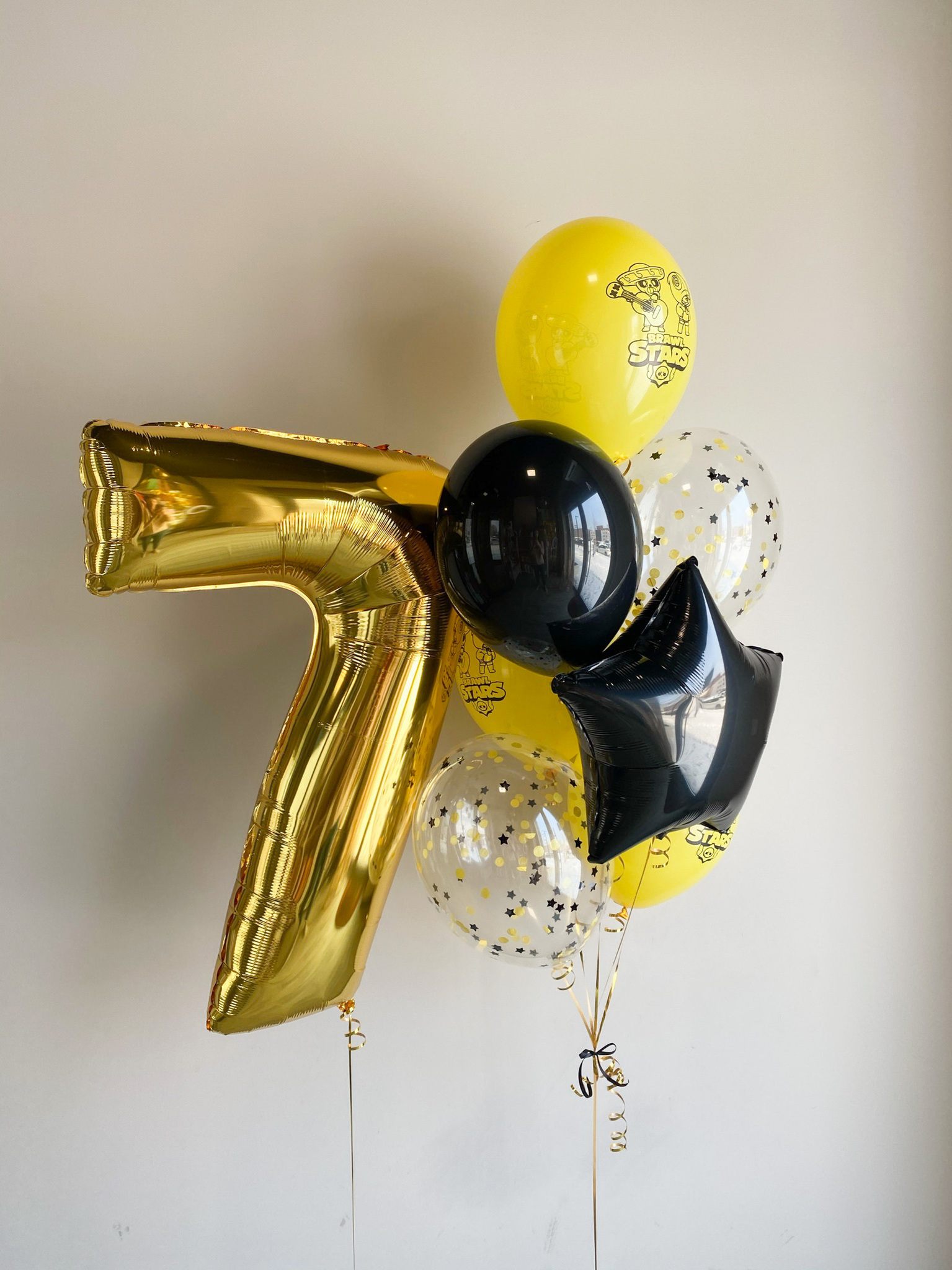 - Фонтан из 7 шаров: звезда, 2 с конфетти, 3 с рисунком и 1 однотонный.