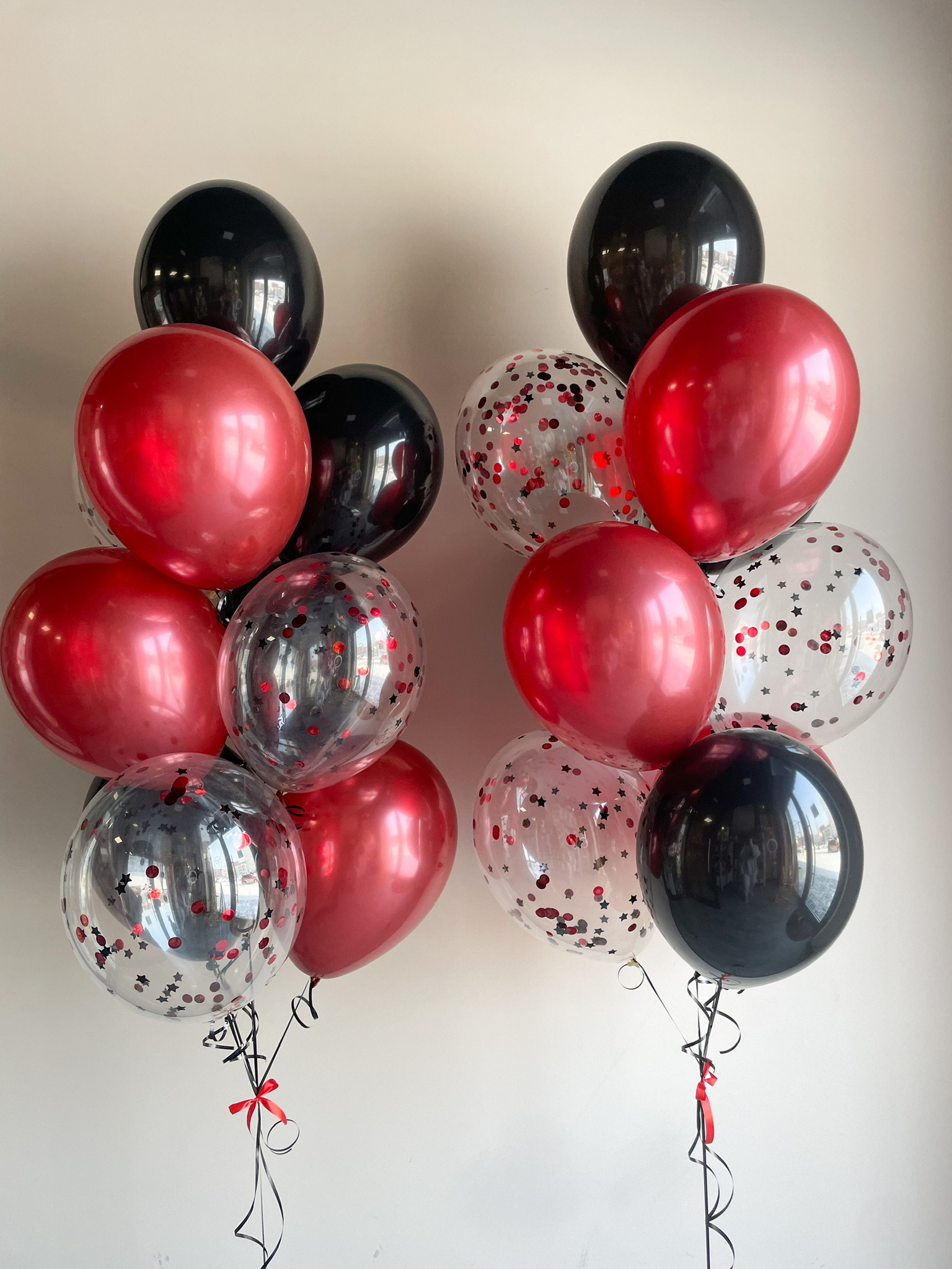 - Два фонтана из 10 шаров: 3 с конфетти, 3 хром и 4 однотонных.