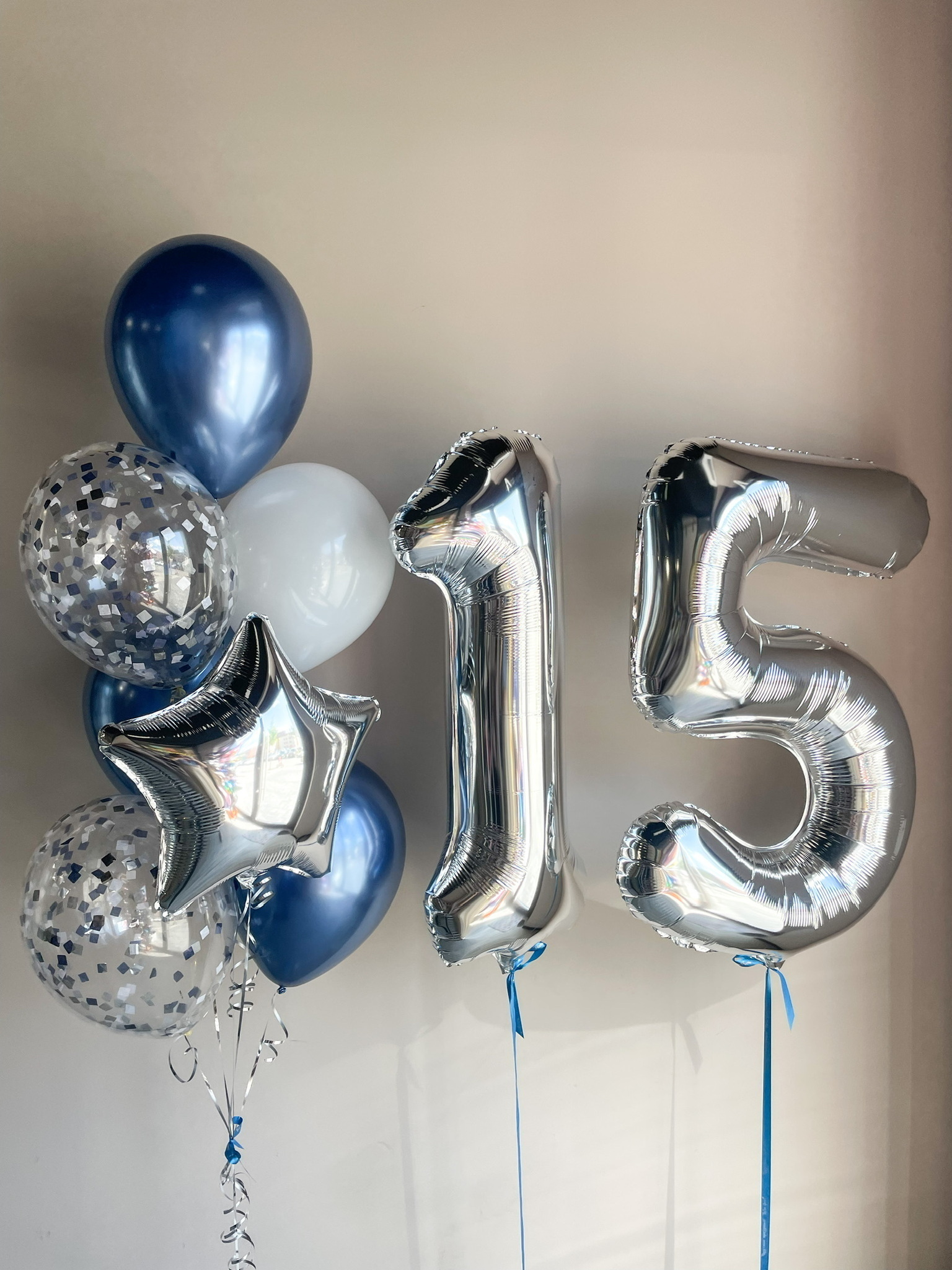 - Фонтан из 7 шаров: звезда, 2 с конфетти, 3 хром и 1 однотонный