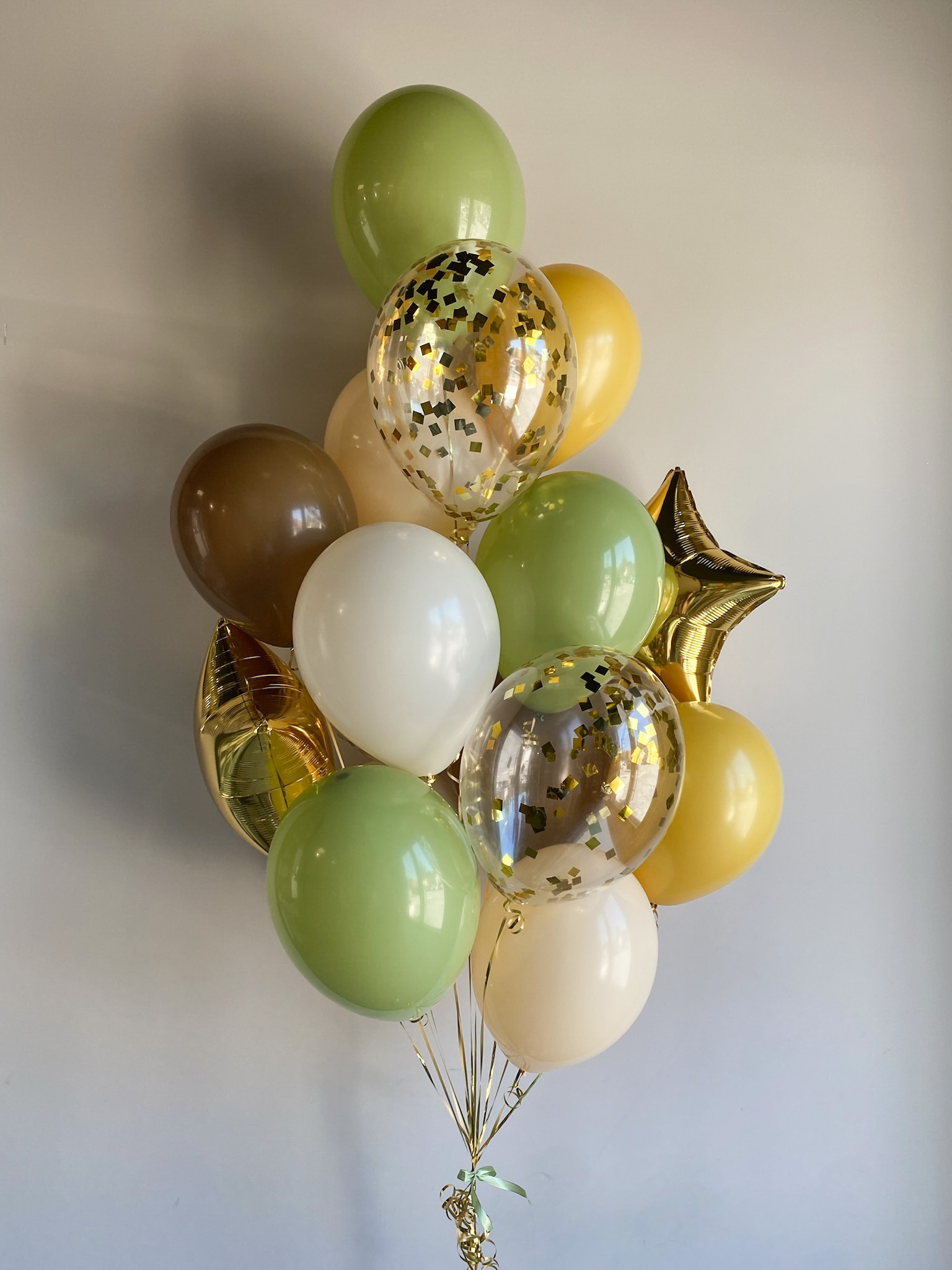 - Фонтан из 15 шаров: 2 звезды, 2 с конфетти и 11 однотонных