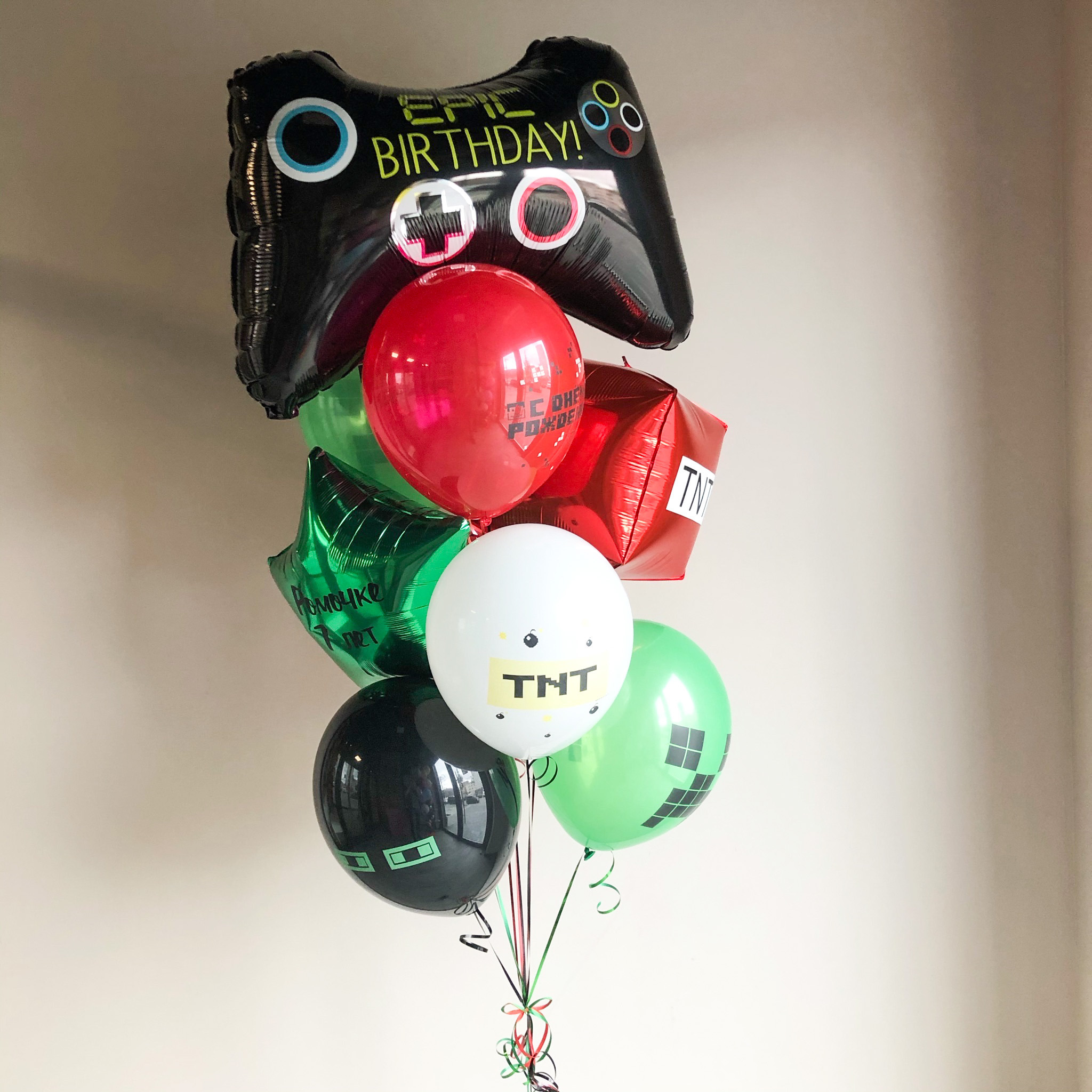 - Фонтан из 9 шаров: фигура Консоль, шар Куб TNT, звезда с индивидуальной надписью, 4 с рисунком, 2 однотонных.