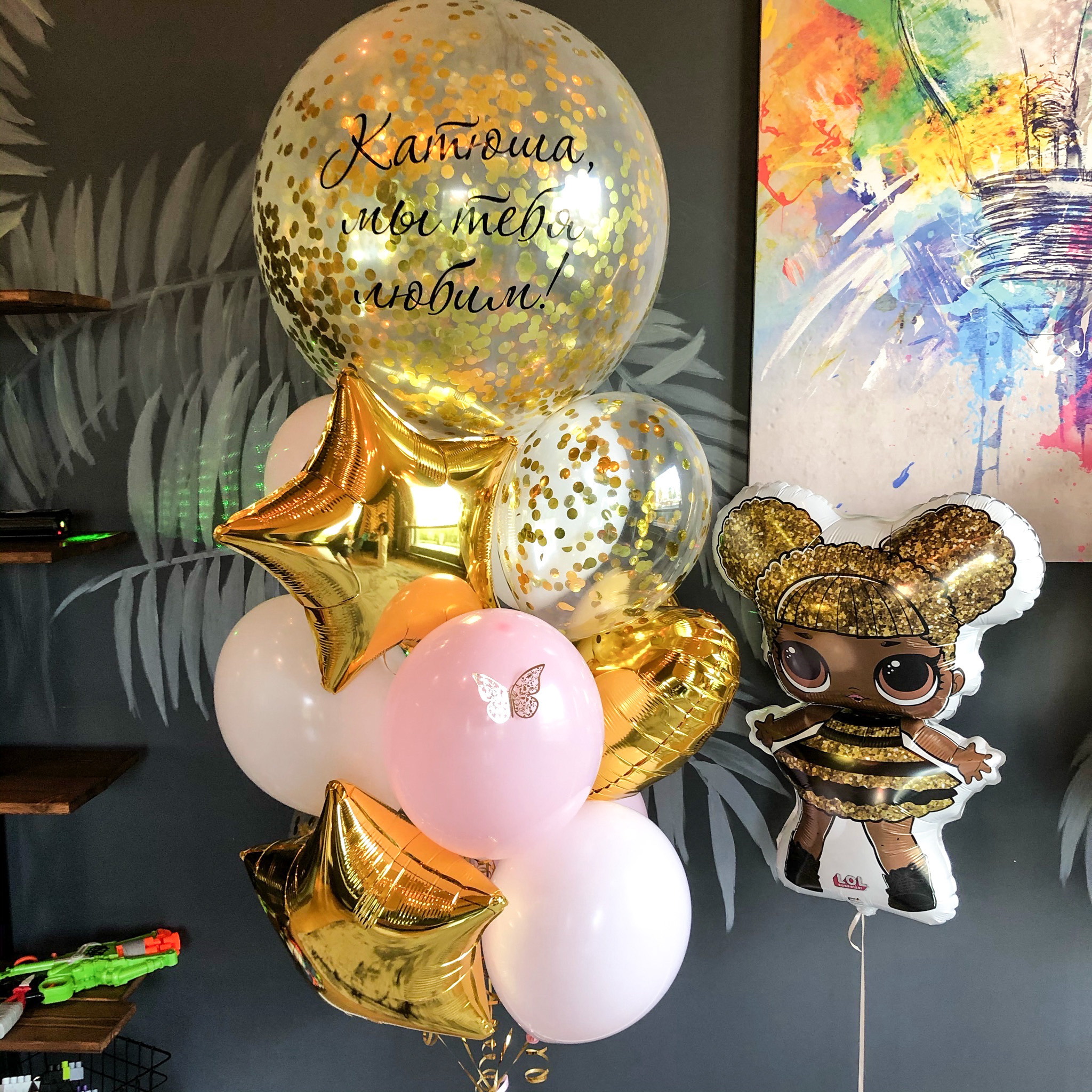 - Фонтан из 13 шаров: Шар гигант с конфетти и индивидуальной надписью, 2 звезды, 1 сердце, 3 с конфетти, 6 однотонных.