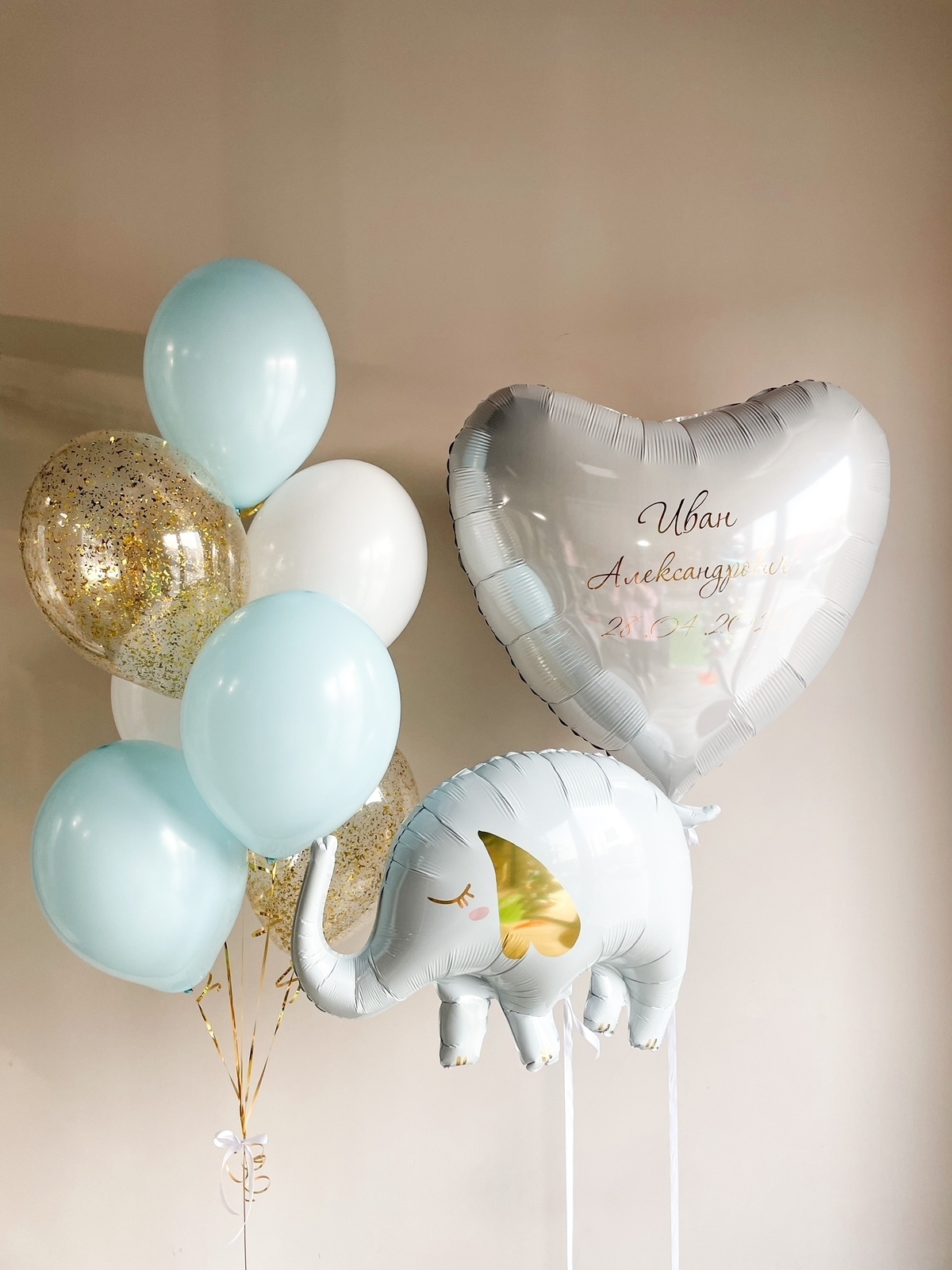 • Фонтан из 7 шаров (3 голубой макарунс, 2 белых, 2 прозрачных с конфетти)