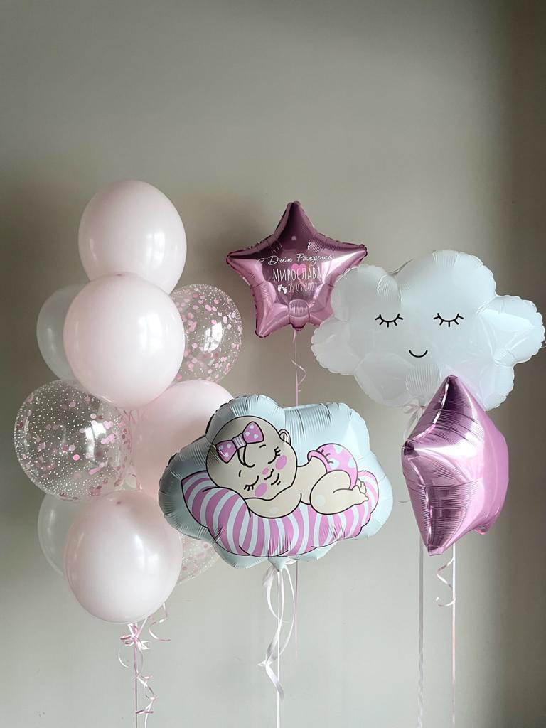 • Фонтан из 10 шаров (4 розовый макарунс, 3 белых, 3 прозрачных с конфетти)